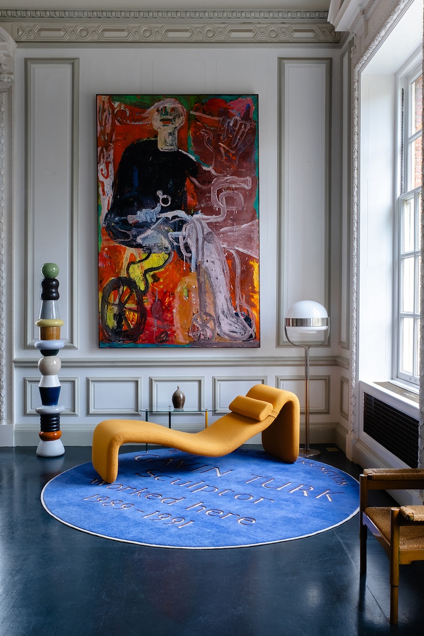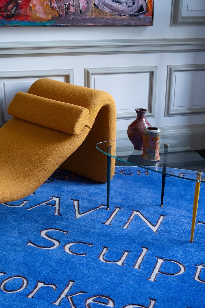 This rug is taken from the plaque the artist made based on those seen on the façades of London houses of distinguished former residents. His examiners on the MA course at the Royal College of Art famously failed him when he submitted this piece for his degree show. The plaque has since gone on to become iconic.