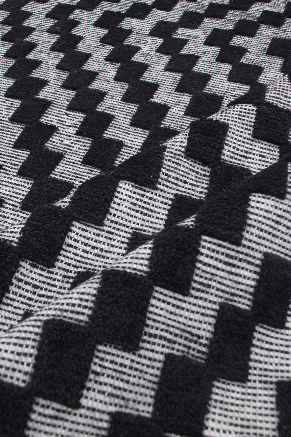 A stepped geometric design with a checked warp and weft.