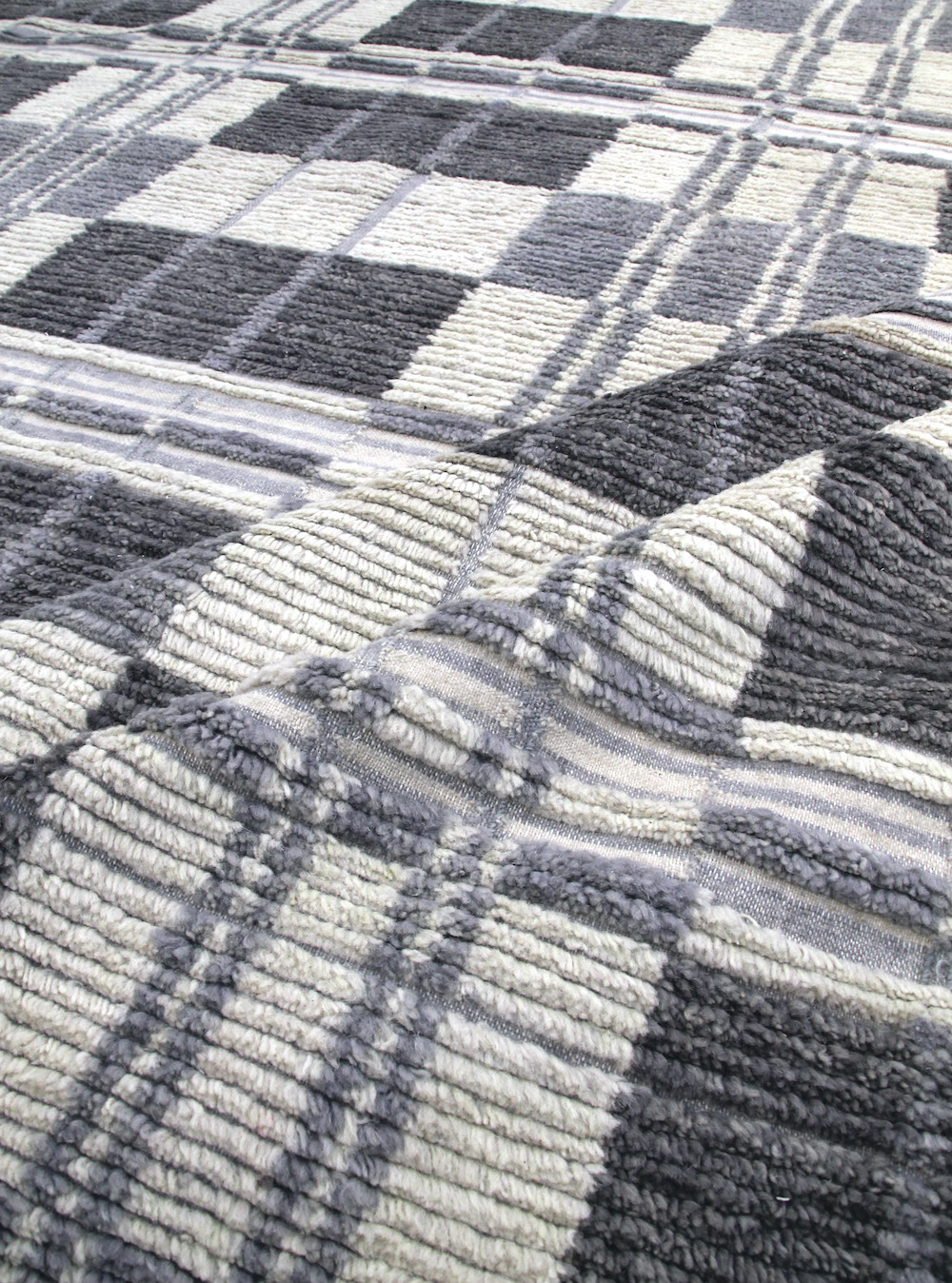 An inspired take on a common plaid in an unexpected woven technique that emphasizes high/low pile transitions.